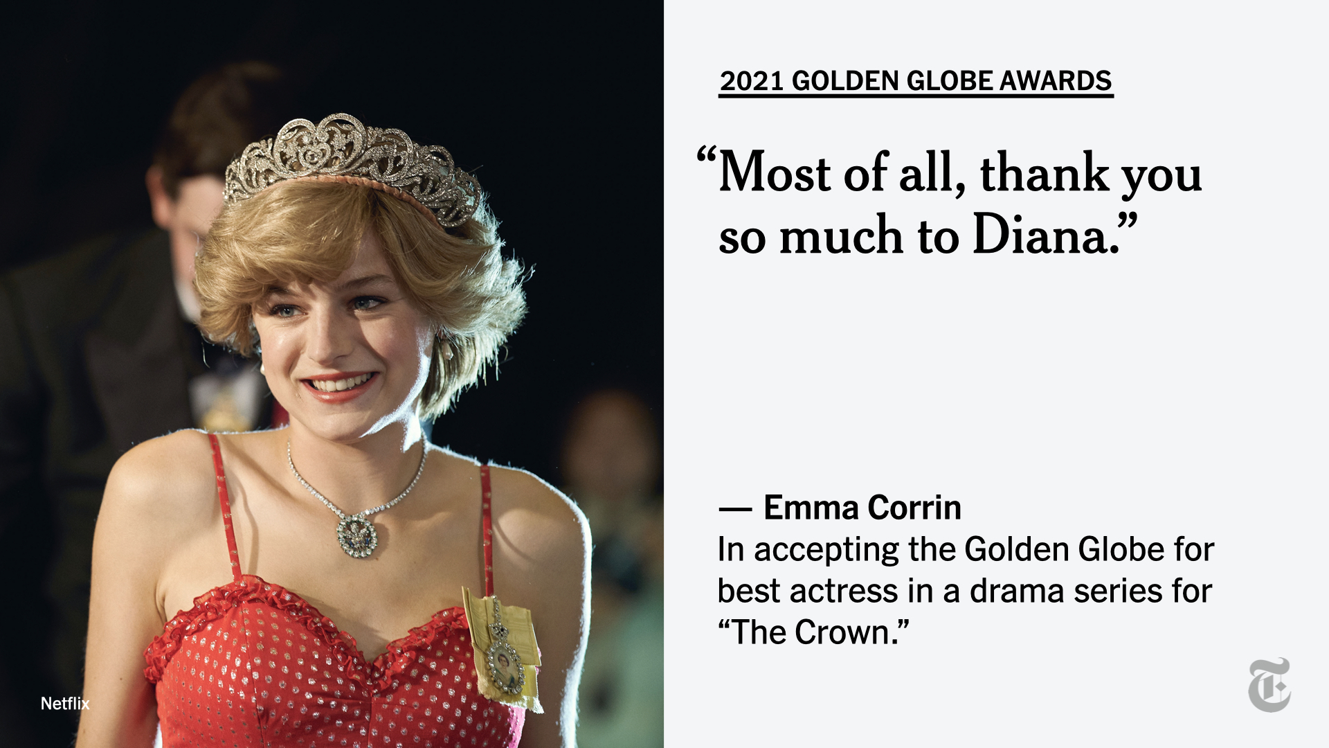 Emma corrin pays an emotional tribute to princess diana as she picks up best. Emma corrin paid tribute to diana, princess of wales, as she was named best actress in a tv drama at the 2021 golden globes. Newcomer emma corrin has been cast as princess diana in the fourth season of the crown. She also said that although she did a lot of research on diana's life, that this was my interpretation of her. Tim graham photo library via getty images.